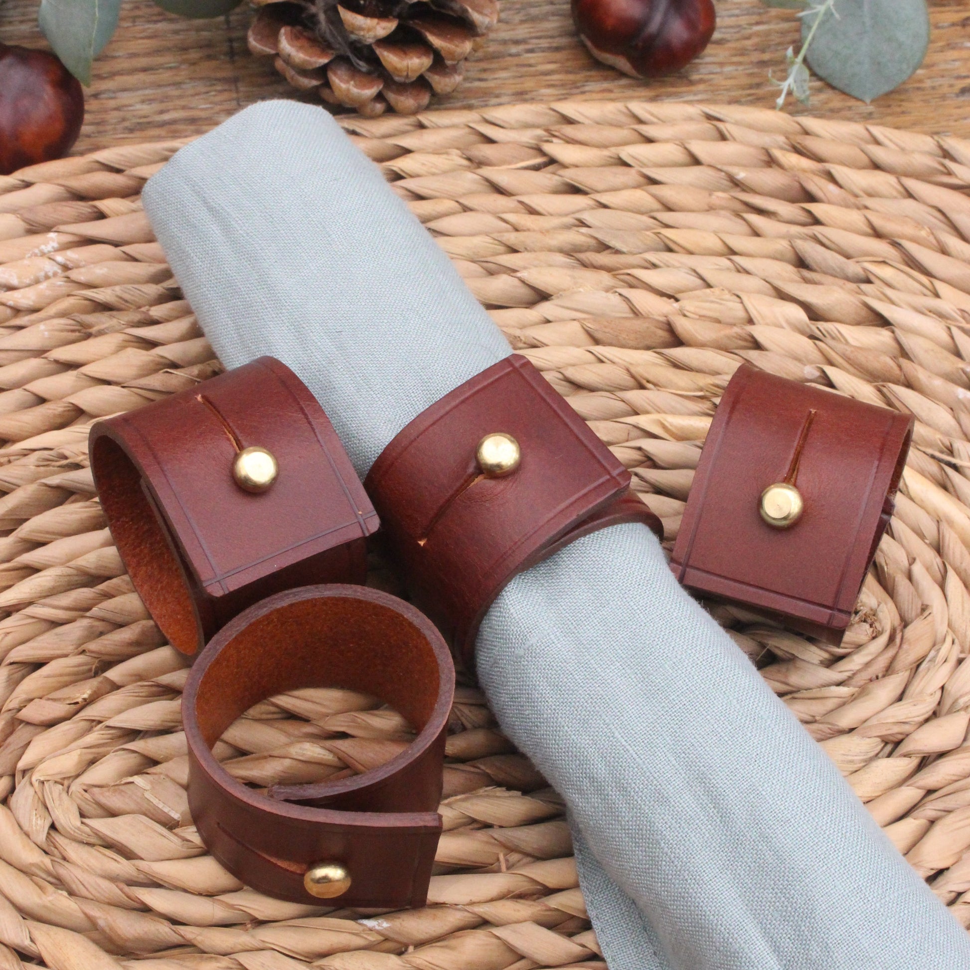Stylish leather napkin rings made from vegetable tanned cowhide in mid brown.