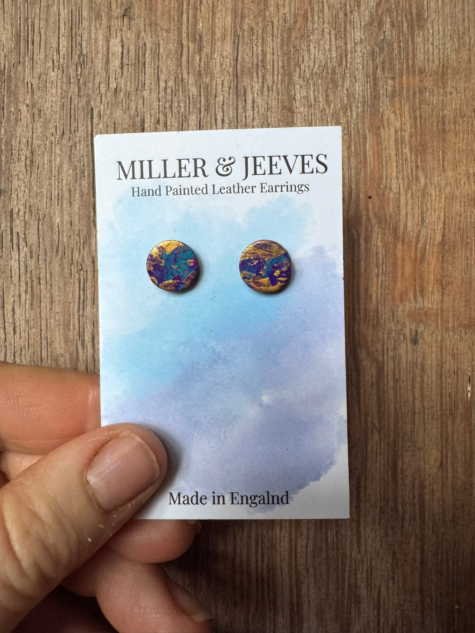 Hand painted leather earrings - gold/blue/deep pink/purple