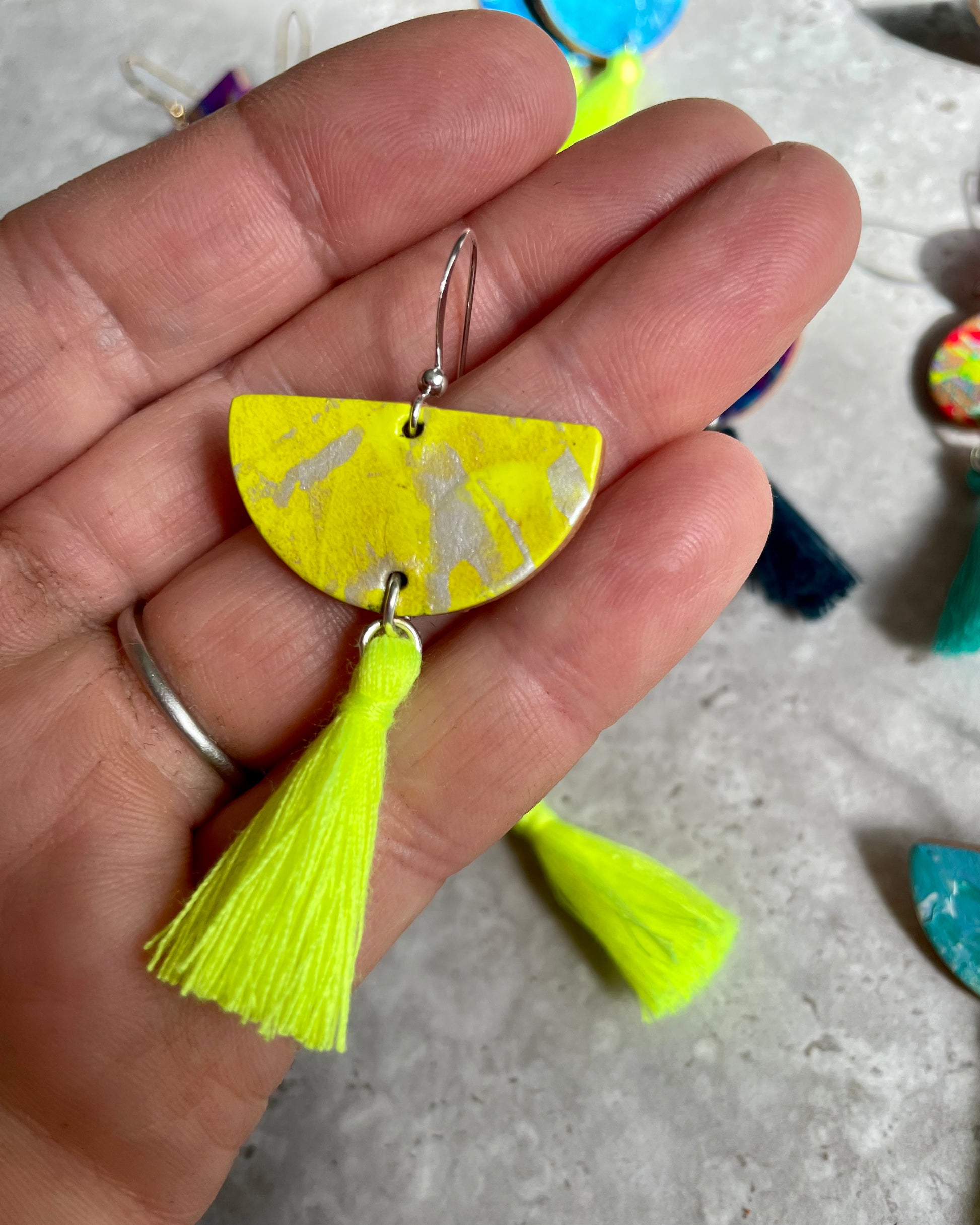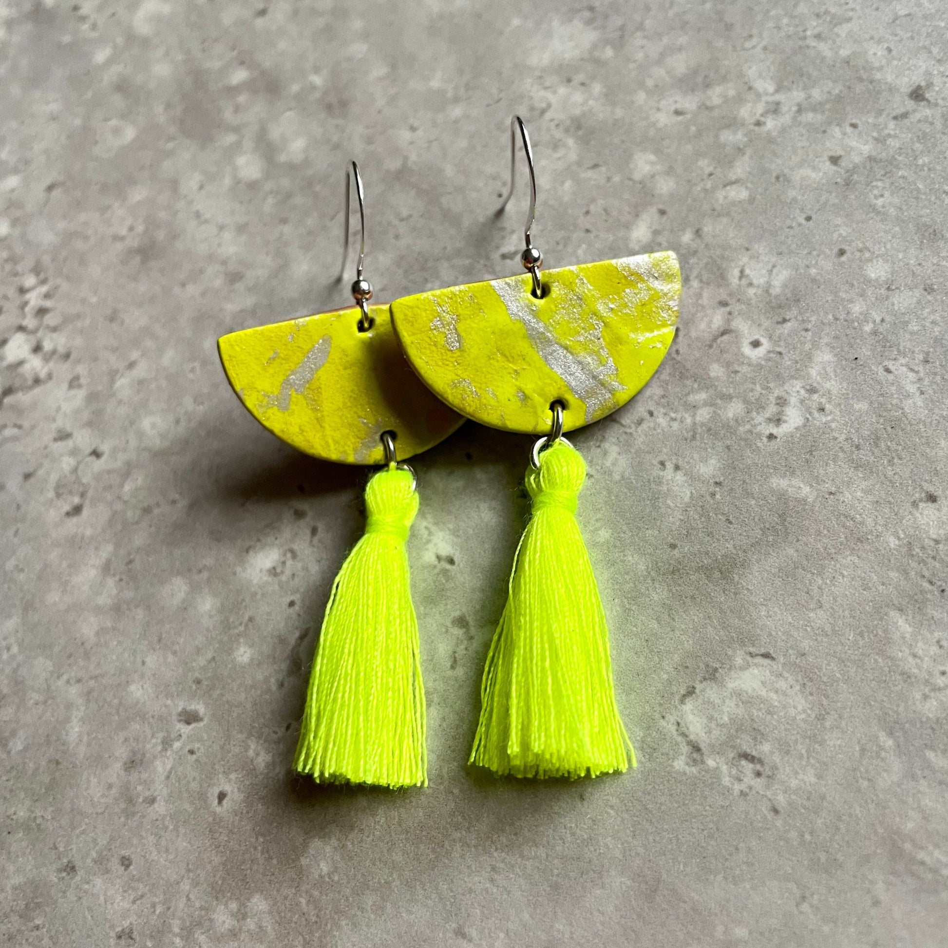 Neon Yellow and Silver Half Moon Hand Painted Leather Earrings with Tassel